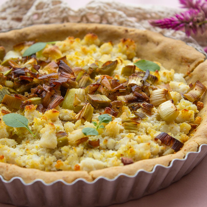Espalhe na torta reservada e por cima coloque o refogado do alho poró.