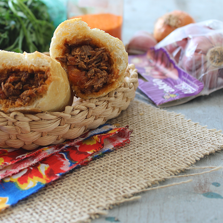 Hambúrguer de pão de alho Akio com carne e molho barbecue